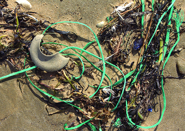 Dans « Homo plasticus », un élément de cordelette en plastique solidarise différents éléments organiques et minéraux en produisant par l’effet du hasard le dessin métaphorique d’un pied humain. Son agrandissement ajusté aux dimensions d’une vitrine déplace l’image de ces débris marins divers en une photographie grand format qui en conte une histoire de matières à la dérive, et montre un pied graphique en plastique monumental pouvant rappeler un vestige de statuaire. Cette photographie micro-perforée permet un point de vue de part et d’autre de la vitrine.